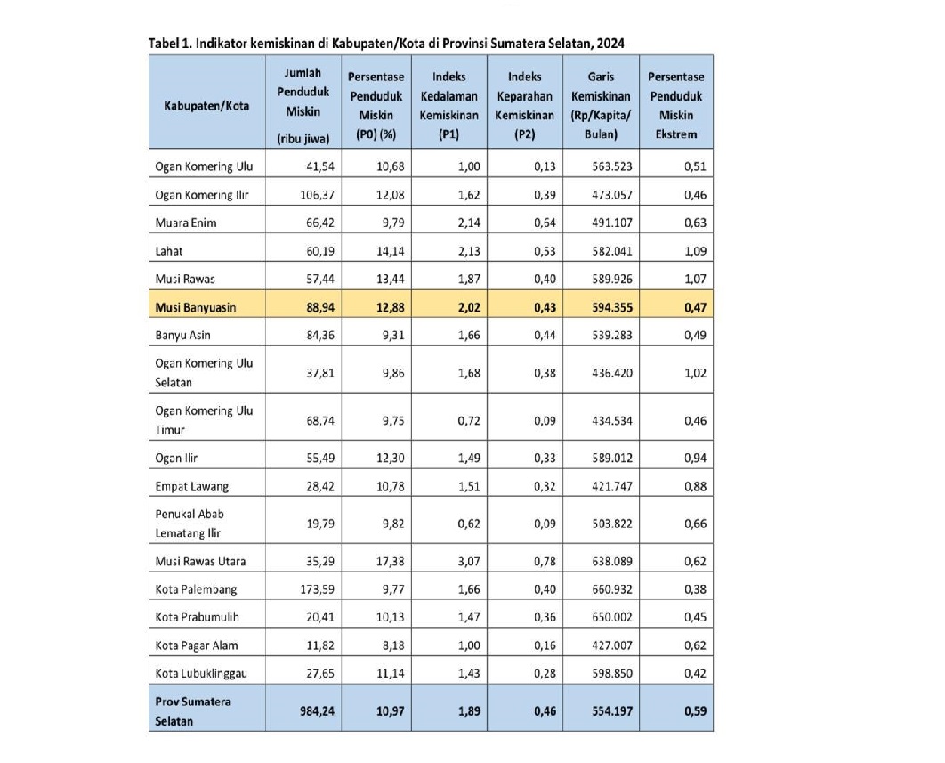 “Persentase penduduk miskin Kabupaten Musi Banyuasin tahun 2024 sebesar 12,88 persen atau turun 2,02 persen poin dari tahun 2023, penurunan ini merupakan