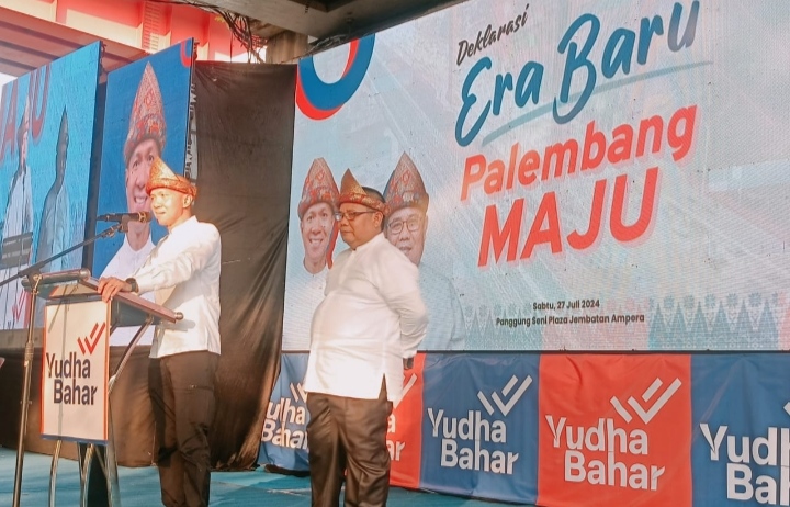KATANEWS.ID, Palembang – Yudha Pratomo Mahyudin – Baharuddin, melaksanakan deklarasi sebagai pasangan balon Walikota dan Wakil Walikota Palembang, pada pilkada 2024 nanti, di bawah Jembatan Ampera, Sabtu (27/7/2024).