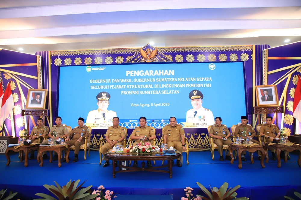 KATANEWS.ID, Palembang – Gubernur Sumatera Selatan (Sumsel) H Herman Deru didampingi Wakil Gubernur (Wagub) H Cik Ujang dan Sekretaris Daerah (Sekda) Drs H Edward Candra MH memberikan pengarahan bagi kalangan Pejabat Struktural Eselon II, Eselon III, seluruh Pejabat Eselon IV dipusatkan di Griya Agung Palembang, Selasa (8/4/2025).