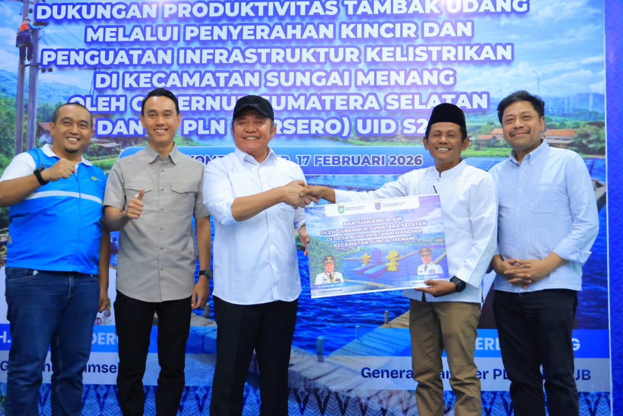 KATANEWS.ID, OKI – Gubernur Sumatera Selatan, Dr. H. Herman Deru, memberikan dukungan langsung dalam upaya meningkatkan produktivitas tambak udang melalui penyerahan bantuan kincir serta penguatan infrastruktur kelistrikan. Bantuan tersebut diserahkan di Kantor Sekretariat Perkumpulan Petambak Udang Wahyuni Mandira, Desa Bumi Pratama Mandira, Kecamatan Sungai Menang, Kabupaten Ogan Komering Ilir, Selasa (17/2/2026).