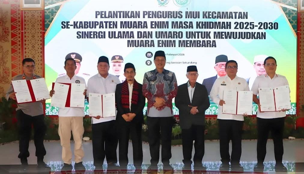 KATANEWS.ID, Muara Enim – Pelantikan pengurus Majelis Ulama Indonesia (MUI) kecamatan se-Kabupaten Muara Enim masa khidmat 2025–2030 berlangsung khidmat di Balai Agung Serasan Sekundang, Rabu (4/2/2026). Kegiatan ini menjadi momentum penting dalam memperkuat peran ulama sebagai mitra strategis pemerintah daerah dalam pembinaan umat.