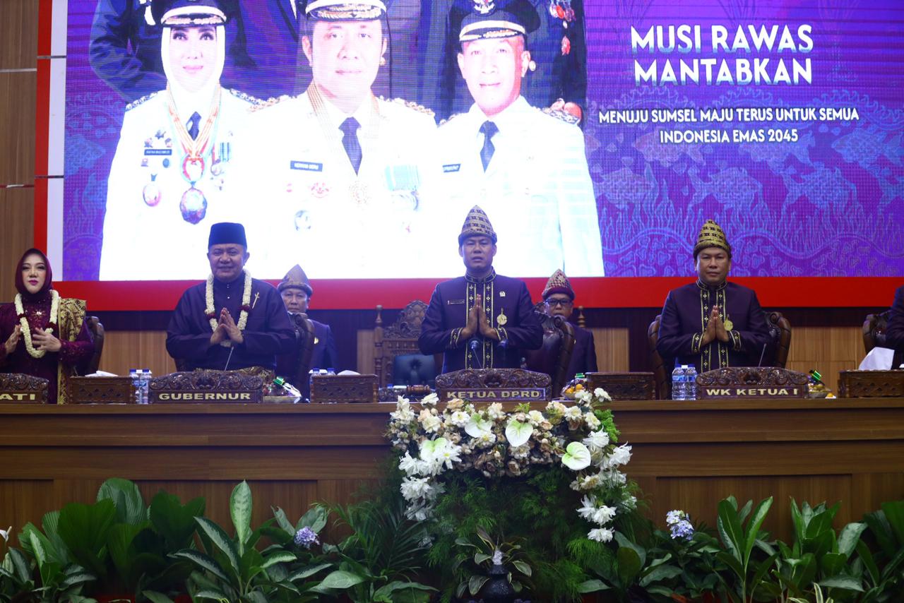 KATANEWS.ID, Musi Rawas – Gubernur Sumatera Selatan (Sumsel) Dr. H. Herman Deru didampingi Ketua TP PKK Provinsi Sumsel menghadiri Rapat Paripurna DPRD Kabupaten Musi Rawas dalam rangka peringatan Hari Ulang Tahun (HUT) ke-83 Kabupaten Musi Rawas. Kegiatan berlangsung khidmat di Gedung DPRD Musi Rawas, Senin (20/04/2026), dan dihadiri unsur Forkopimda, kepala OPD, tokoh masyarakat, serta berbagai elemen masyarakat.